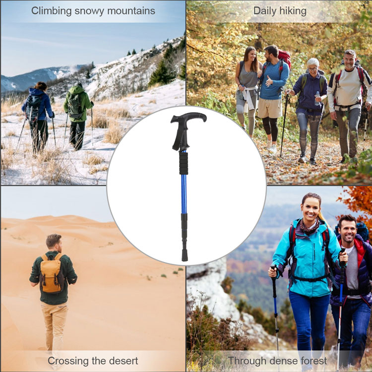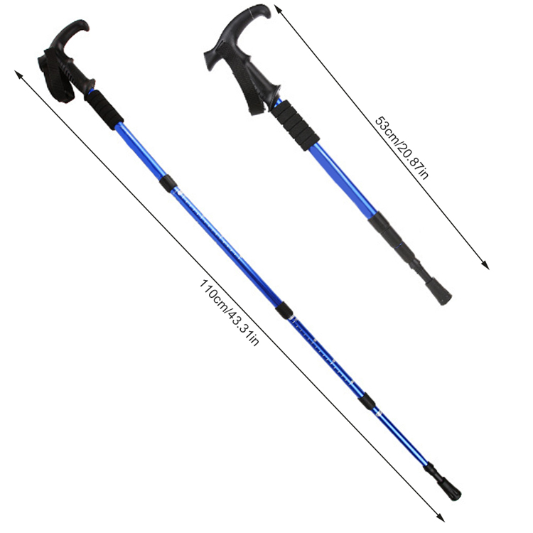 Телескопични алуминиеви трекинг стълбове са противоречив инструмент, който се използва предимно от туристи и алпинисти, за да им осигури помощ и стабилност при тяхното темпо на груби и нестабилни терени. Защо имате нужда от бастун? 1. Намалете стреса на гърба и подобрете стойката. 2. Запазете баланса си и подобрете стабилността. 3. Намалете компресивната сила на коленете с до 25%. 4 Действа като сонда, за да ви помогне да прецените повече на опасни терени или подвижни повърхности